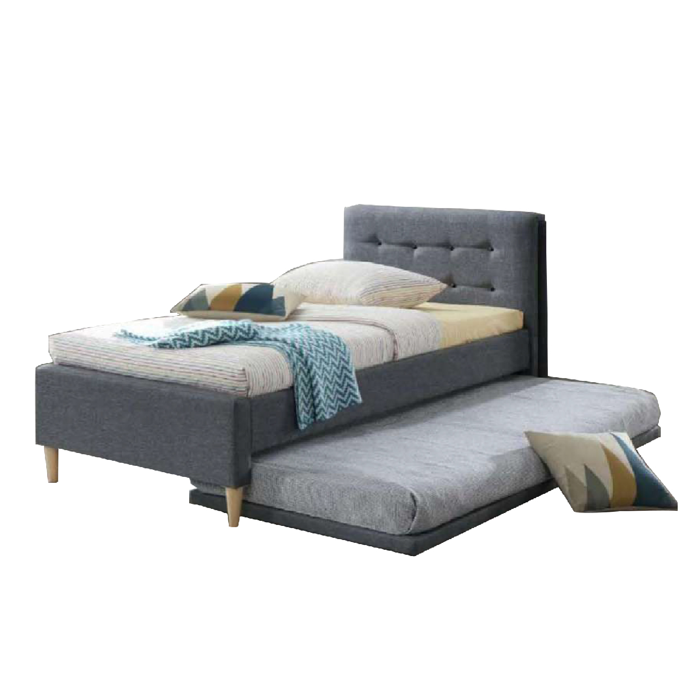 - Gray padded bed frame with pull-out bed